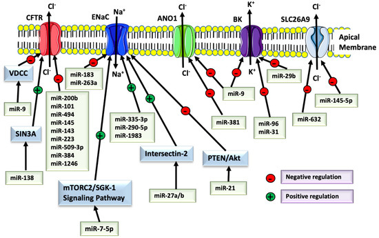 ENaC-mediated Na+ absorption depends on the Cl− conductance of CFTR and plays an essential role in ASL homeostasis by increasing water reabsorption from the ASL [101,102,103,104,105]. Several miRNAs regulate ENaC expression and function. miR-21 inhibits ENaC expression via the PTEN/AKT signaling pathway [46]. A recent study in Drosophila demonstrated that miR-263a (the human ortholog of miR-183) reduced ENaC expressions while miR-183 inhibited the three subunits of human ENaC [106]. Downregulation of miR-263a in Drosophila showed a phenotypic resemblance to the CF phenotype. miRNAs can also indirectly regulate ion channels by targeting mRNA of the intermediary proteins involved in the channel biogenesis. For example, miR-7-5p inhibited mTORC2/SGK-1 signaling pathway by downregulating mRNA expression levels of both mTOR and SGK-1, leading to a subsequent reduction of ENaC expression in A549 cells [47].
