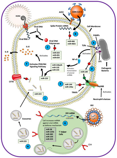 Role of miRNAs in the host–pathogen interaction. (A) Toll-like receptors (TLRs) engage with the pathogen-associated molecular patterns (PAMP) and activate the transcription factor nuclear factor-κB (NF-κB) in the host cell. (B) miRNA directly targets the mRNA of retroviruses in host cells. (C) miRNA participates in defense mechanisms and targets the genomic replication of viral DNA. (D) LPS inhibits miR-149, a direct inhibitor of MyD88, allowing activation of inflammation via the MyD88/IRAK/TRAF6 signaling pathway and expression of IL-8 in the CF airway. (E) Viral stimulated miR-144 and miR-146a target the TRAF6 signaling pathway to counteract the interferon defense responses in the human airway. (F) miRNA activated by NF-κB targets proteins that inhibit the PI3K/Akt signaling pathway to activate inflammation via IL-8. (G) Immune cells such as T helper cells can increase the expression of miRNAs against viral mRNA as defense mechanisms. (H) miRNA can also be transported from one cell to other cells through extracellular vesicles and could target ion channel proteins such as CFTR (I). ACE2: Angiotensin-converting enzyme-2; SARS-CoV-2: Severe acute respiratory syndrome coronavirus 2; PAMPs: Pathogen-associated molecular patterns; TLRs: Toll-like receptors; LPS: Lipopolysaccharide; NF-κB: nuclear factor-κB; MyD88: Myeloid differentiation primary response 88; IRAK: interleukin-1 receptor-associated kinase; TRAF6: tumor necrosis factor receptor-associated factor 6; H1N1: A subtype of Influenza A virus; HIV: Human immunodeficiency virus; miR/miRNA: micro RNA; mRNA: messenger RNA; IL-8: Interleukin-8; CFTR: Cystic fibrosis transmembrane conductance regulator; CD4: Cluster of differentiation 4; PI3K: Phosphoinositide 3-kinases; Akt: Protein kinase B (a serine/threonine-specific protein kinase).