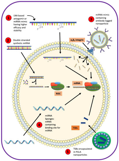 Approaches for miRNA-based therapeutic strategies. The following strategies increase stability, efficacy, and specificity of miRNA-based approaches: (1) locked nucleic acid (inaccessible RNA) modification is used in miRNA mimics or antisense-oligonucleotides (antagomirs), where the ribose moiety contains an extra bridge connecting the 2’ oxygen and 4’ carbon; (2) synthesis of double-stranded synthetic miRNA oligonucleotides; (3) coupling of miRNA mimics to antibody-coated nanoparticles; (4) delivery of mRNA expression vectors, containing miRNA sponges: mRNA containing a binding site for miRNA; and (5) using target site blockers (TSBs) encapsulated in poly-lactic-co-glycolic acid (PLGA) nanoparticles. LNA: locked nucleic acid; miRNA: micro RNA; mRNA: messenger RNA; RISC: RNA induced silencing complex; TSB: target site blockers; PLGA: poly-lactic-co-glycolic acid.