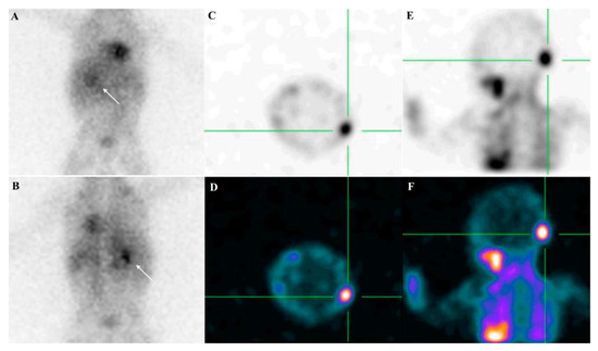Pre-therapeutic staging in a 4-year-old child with neuroblastoma, performed with 123I MIBG scintigraphy/ single-photon emission computed tomography (SPECT). Planar images (A, anterior; B, posterior) show high uptake of the tracer in the right adrenal gland (white arrow), corresponding to the primary site of the tumor. Moreover, SPECT images of the skull (C–F) demonstrate the presence of metastasis in the occipital bone. Figures E and F display the physiological activities in the salivary glands and in the heart.