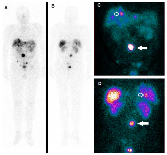 A 17-year-old male with mental retardation due to perinatal hypoxia, suffering from carcinoid syndrome due to ileal NET with hepatic metastases. Since symptomatology persisted despite somatostatin analog therapy and CT gave evidence of tumor progression, PRRT with 177Lu-DOTATATE was considered. Whole Body scan in anterior (A) and posterior (B) view, as well as the planar (C, anterior; D, posterior), acquired with gamma camera centered on the 177Lu photopeak at 113 KeV, well-demonstrated tracer incorporation both in the tumor (C,D, white arrow) and in the liver lesions (C,D, white-bordered arrow). Three further focuses of increased accumulation of the radiopharmaceutical are visible under the primary tumor in the pelvic region, especially evident in the anterior view (C), to be referred to peritoneal carcinomatosis.