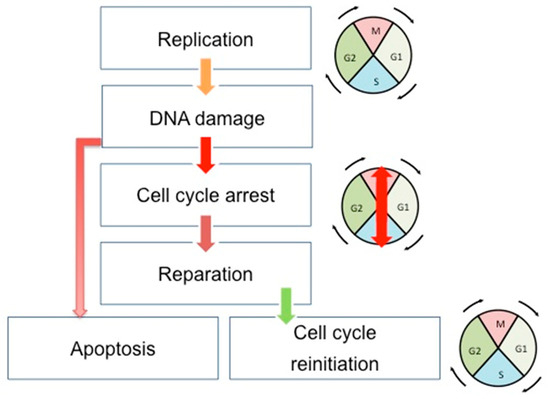 Schematic view of the correlation between cell cycle, DNA repair, and apoptosis pathways. During the cell cycle, if the DNA error is correctly repaired, the cells can restart their progression through the cell cycle. However, if the DNA damages are too important, the cells undergo apoptosis. Double-headed arrows indicate the evolution of the cell cycle phases: M (Mitosis), G1, S (Synthesis), and G2.