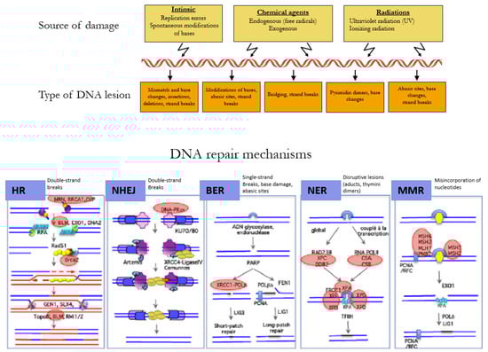 Mechanisms of DNA repair according to the type of lesion. DNA double-strand breaks are repaired by the error-free pathway Homologous Recombination (HR) or the error-prone pathway Non-Homologous End Joining (NHEJ). Single-strand breaks are repaired by base excision repair (BER), bulkier single-strand lesions that distort the DNA helical structure are repaired by Nucleotide Excision Repair (NER), and misincorporation of nucleotides resulting in mismatches in the DNA sequence are repaired by Mismatch Repair (MMR). Adapted with permission from Rass et al. [30].