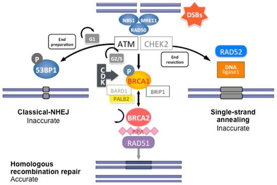 In short, HR DNA repair begins after recognition of the 5′ends of the double-strand DNA break by the MRN complex (MRE11-RAD50-NBS1) (Figure 3). This complex recruits Ataxia telangiectasia mutated (ATM), a protein kinase. ATM subsequently phosphorylates downstream proteins, particularly BRCA1, as well as CHEK1 and CHEK2, which are two serine/threonine-protein kinases inducing cell cycle arrest at the G1/S and G2/M cell cycle checkpoints, allowing DNA damages repair [24]. The phosphorylation of BRCA1 by ATM induces its recruitment to DNA damage sites and its binding to the BRCA1-associated RING domain (BARD1), a E3 ubiquitin-protein ligase essential for BRCA1 stability [24]. CDK activity, which increases in the S and G2 phases of the cell cycle, also favors BRCA1 activation and DNA repair by HR. BRCA1 activation then allows extensive 5′ end resection to produce 3′ single-stranded DNA and the induction of the RAD51 loading to the single-stranded DNA by the BRCA1/BRCA2/PALB2 complex. PALB2 recruits BRCA2 and RAD51 to DNA break sites by enhancing BRCA1–BRCA2 interaction and binding DNA with high affinity for D loop [24]. DNA is then repaired using the homologous region of the chromatid as a replicative template.