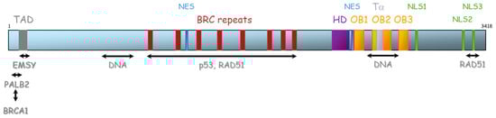Representation of BRCA2 protein and its domains of interaction with protein partners. TAD: transactivation domain, NES: nuclear export domain, HD: helical domain, OB: oligosaccharide binding, Tα: Tower alpha, NLS: Nuclear localization signal.