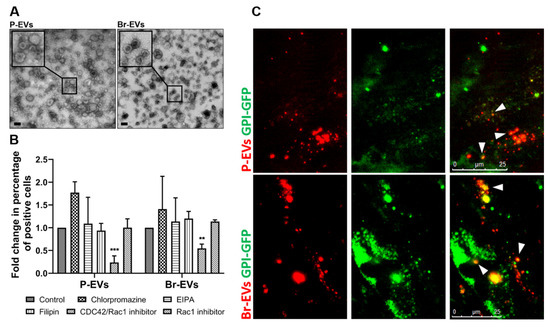 To elucidate the mechanisms underlying the uptake of breast cancer-derived EVs by astrocytes, we first explored the possibility of the involvement of specific endocytosis mechanism(s) in this uptake. Endocytic pathways such as macropinocytosis, clathrin-dependent and caveolin-dependent endocytosis have been commonly reported to be involved in the uptake of EVs by different cell types [17]. We used chemical inhibitors of the different endocytosis pathways, including EIPA, chropromazine, and filipin to evaluate the effect of macropinocytosis, clathrin-dependent, and caveolin-dependent endocytosis, respectively. Interestingly, none of these inhibitors could inhibit the uptake of EVs (1010 particle/ well in a 12-well plate) following a 3 h incubation period, demonstrating that these common pathways were not involved in the uptake of EVs by astrocytes (Figure 1B). This finding was also in contrast to our previous findings demonstrating the involvement of macropinocytosis and clathrin-dependent endocytosis in the uptake of Br-EVs by brain endothelial cells [11] and emphasizes the cell-type dependency of EV uptake mechanisms.