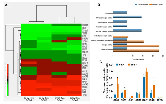 Quantitative proteomics analysis was performed using the isobaric tags for relative and absolute quantitation (iTRAQ) technique as we have described previously [54]. For protein identification, the peak list was searched against the Swiss-Prot database including all human proteins. Both detection and differential expression analyses were carried out using the ProteinPilot v3.0 software (AB SCIEX). An unbiased ProtScore of >1.3, which corresponds to 95% confidence in detection (p < 0.05) was used for analysis. Significantly differentially expressed proteins between two samples were identified based on the ratio of the protein expression levels in the two samples (p < 0.05). Hierarchical clustering of samples and features was done using the unweighted pair group method with arithmetic mean (UPGMA) method, with Pearson’s correlation as the distance measure [55]. The expression data matrix was row-normalized prior to the application of average linkage clustering. Functional enrichment analysis of the proteins that were enriched in Br-EVs was performed using the FunRich software, v3.1.3 [21].