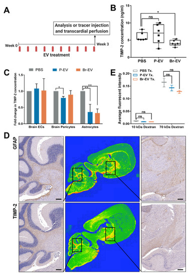 Br-EVs decrease the astrocyte expression of the tissue inhibitor of matrix metalloproteinases-2 (TIMP-2). (A) Schematic showing the EV functional study design. (B) Average concentration of TIMP-2 in brain tissue homogenates measured by a mouse TIMP-2 enzyme-linked immunosorbent assay (ELISA) (mean ± SD; n = six mice per group). Statistical analysis was performed using the Mann–Whitney test. (C) Average fold change in concentration of TIMP-2 in conditioned media of brain endothelial cells, pericytes and astrocytes treated with PBS, P-, and Br-EVs (mean ± SD; three independent experiments). Statistical analysis was performed using two-way ANOVA with Sidak’s multiple comparison tests. (D) Representative images of mouse brain sections immunostained with anti-GFAP (upper panels) and anti-TIMP-2 (lower panels), demonstrating colocalization of GFAP astrocyte marker and TIMP-2. Middle panels represent a colormap of areas of protein enrichment (three independent experiments). Scale bar, 200 µm. (E) Average fluorescence intensity in perfused brain tissue homogenates collected 45 min following injection of a combination of 10 KDa Alexa647 dextran and 70 KDa FITC dextran (mean ± SD; n = three mice per group). Statistical analysis was performed using the Mann–Whitney test. In all panels: ns, not significant; * p ≤ 0.05; ** p ≤ 0.01.