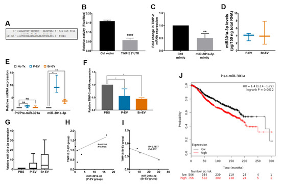 To evaluate the ability of breast cancer-derived EVs to transfer this miRNA to the brain in vivo, we analyzed the level of miR-301a-3p in brain tissues collected from the in vivo experiment described above. It is important to note that the conserved and identical sequence of miR-301a-3p in mouse and human limited our ability to detect and analyze the direct transfer of miR-301a-3p by human breast cancer-derived EVs. Nevertheless, an increasing trend in the levels of miR-301a-3p was observed in mice that were treated with Br-EVs (Figure 4G). Importantly, the level of miR-301a-3p was significantly and negatively correlated with the level of TIMP-2 in Br-EV-treated mice, whereas this correlation was not observed in P-EV-treated mice (Figure 4H,I). These studies demonstrated a correlation between the level of miR-301a-3p and the observed downregulation of TIMP-2 in vivo. Given that Br-EV-driven downregulation of astrocyte TIMP-2 can occur prior to brain metastasis formation, miR-301a-3p has the potential to serve as a diagnostic marker for early stages of brain metastasis. Interestingly, analysis of 1262 patients in the Molecular Taxonomy of Breast Cancer International Consortium (METABRIC) [47] dataset demonstrated that higher levels of miR-301a-3p were significantly associated with decreased survival (www.kmplot.com, Figure 4J).