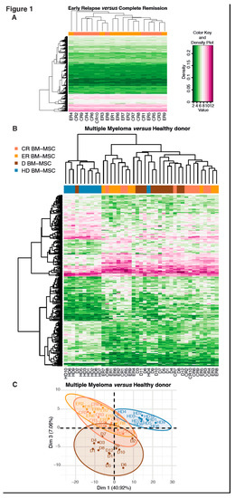 MSC from patients who had completed treatment had a transcriptome that was essentially identical to that of D BM-MSC. Once modification of the MSC was achieved, the change was permanent, even when the patient was in remission after achieving a CR. This suggests persistent printing, whatever the disease stage. However, as significant progress was recently made for response evaluation in MM with the development of high-sensitivity minimal residual disease [27], it would be of interest to compare MSC from patients in CR with Minimal residual disease (MRD) < 10−6 and MSC from patients in CR with positive MRD. We wish we could have used a paired samples cohort (diagnosis-remission-relapse) from the same patients for this study, but this purpose was not realistic, given the current median progression free survival of the MM patients. We only studied one patient with two time points (diagnosis and remission); as shown in Figure S3, transcriptomes were almost identical, with no significant differences, according to the heatmap.