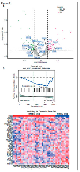 Wnt pathways involved in the difference between MM BM-MSC and HD BM-MSC. Volcano plot of differentially expressed genes in MM vs. HD BM-MSC with the impact of genes on osteogenesis and the Wnt pathway (A). Representative Gene Set Enrichment Analysis (GSEA) of the MM vs. HD BM-MSC list of expressed genes with the pathway of Gene Set 256 (GO Wnt signaling pathway). Wnt signaling pathway was downregulated by MM vs. HD BM-MSC. The corresponding heatmap of the represented genes is also shown (B).