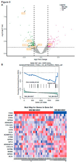 Immunity pathways involved in the difference between MM BM-MSC and HD BM-MSC. Volcano plot of the differentially expressed genes from MM vs. HD BM-MSC, with the impact of genes from the immunity pathway. (A) Representative GSEA of MM vs. the HD BM-MSC list of the expressed genes with the pathway of Gene Set 304 (GSE15659 non-suppressive T cell vs. activated T reg). Immunity pathway is downregulated by MM vs. HD BM-MSC. The corresponding heatmap of the represented genes is also shown (B).