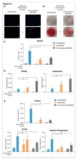 Since the osteoblast differentiation pathway and the Wnt pathway seemed to alternate (Figure 2A,B) and because many authors have reported the impaired osteoblastic potential of D BM-MSC [21,22,23,24], we compared the potential for adipocyte and osteoblast differentiation of MSC in the groups of patients, using RT-PCR analysis of specific gene expression, as described in the Materials and Methods section. Prior to this analysis, we used colorimetric tests to verify that post-treatment BM-MSC (ER and CR BM-MSC) were able to differentiate into adipocytes and osteoblasts [21]. Both post-treatment and HD BM-MSC differentiated into adipocytes (Figure 4A) and osteoblasts (Figure 4B,C), after 21 days of culture with the differentiation media. Post-treatment BM-MSC exhibited a significant increase in lipid accumulation between D0 and D21 of adipocyte differentiation (Figure 4A) and seemed to differentiate more likely into adipocytes than HD BM-MSC. On the other hand, the capacity for osteoblastic differentiation was impaired in post-treatment BM-MSC, including MSC from patients in complete remission (Figure 4B). Hence, post-treatment BM-MSC differentiated preferentially into adipocytes rather than osteoblasts, whatever the disease stage, thus, confirming the transcriptomic profile. To confirm this observation, we analyzed the expression of several genes involved in the multipotency of the MSC. Post-treatment BM-MSC overexpressed the genes implicated in adipocyte differentiation (PPARγ and adiponectin) (Figure 4D), while the expression of osterix, alkaline phosphatase, and Runx2 (involved in osteoblast differentiation) were down-regulated (Figure 4E). Of note, the increase in the expression of genes involved in adipogenesis was three-fold higher in post-treatment BM-MSC than in HD BM-MSC.