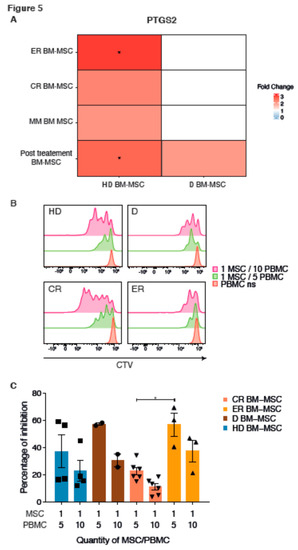 Modulation of immunity. Heatmap representation of PTGS2 FC, between HD, D, ER, CR BM-MSC, or a combination of all MM (D, ER, and CR) BM-MSC, from red for upregulation to blue for downregulation. Groups on the left were compared to the bottom ones (A). Inhibitory effect of MSC from HD and MM BM-MSC on PBMC proliferation. Effect of MSC on cytotoxic CD8 T-cell proliferation. HD BM-MSC (n = 4), D BM-MSC (n = 2), CR BM-MSC (n = 6), and ER BM-MSC (n = 3) were cultured in the presence of increasing number of cell trace violet (CTV)-labeled PBMC for 5 days at the concentration of 1/5 or 1/10 MSC/PBMC, respectively. Then, all cells were harvested and analyzed by flow cytometry. Representative figure of different CD8 T-cell proliferation is shown with CTV. Non-stimulated PBMC in red represent the control of non-proliferation and was CTV-positive. 1MSC/5PBMC (green) and 1MSC/10PBMC (pink) show the CD8 proliferation inversely correlated with MSC quantity (B). Percentage of inhibition was calculated as follows: 100 − (percentage of CD8 T-cell proliferation with MSC/percentage of CD8 T-cell proliferation without MSC) ×100. Significant difference was observed between ER and CR BM-MSC. HD BM-MSC are representing in blue (■) D BM-MSC in brown (•), CR BM-MSC in salmon (▼) and ER BM-MSC in orange (▲). Data are expressed as mean ± SEM of the inhibition percentage of CD8 T lymphocytes. Each experiment was performed in triplicates from three independent experiments; (C). * p < 0.05.