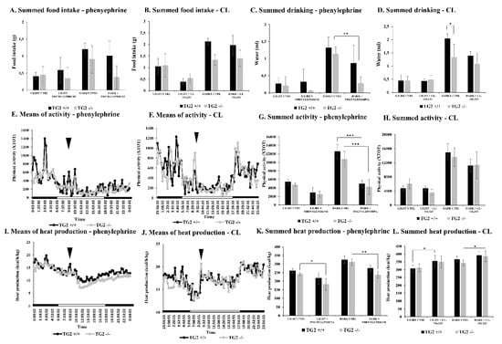 The strains generated the same amount of heat on the control day (Figure 1I–L); however, phenylephrine treatment decreased the summed total heat production only in the TG2-/- strain on the measurement day compared to the control day (light period: 181+/−35 kcal/kg vs. 241+/−7.5 kcal/kg, p < 0.05; dark period: 238+/19 kcal/kg vs. 312+/−20 kcal/kg, p < 0.05; Figure 1I,K). Furthermore, after injection of CL, the TG2+/+ mice increased heat production in the light period and the TG2-/- animals in the dark period on the measurement day, but it is more important that there were no differences when the strains were compared to each other in the investigated periods (Figure 1K,L).