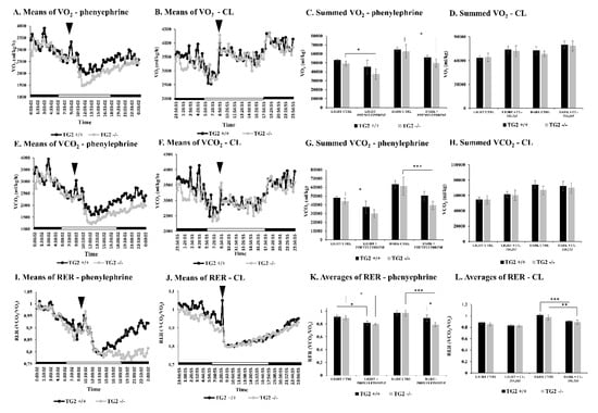 RER values (VCO2/VO2) of TG2-/- and TG2+/+ mice were very similar both in the light and the dark periods of the control day before phenylephrine treatment (Figure 2I–K). After absorption of intraperitoneally injected 60 nM/g body weight phenylephrine the RER values of both strains significantly decreased similarly in the first part of the light period on the treatment day demonstrating that the treatment affected. However, while the RER value of the TG2+/+ strain started to increase constantly in the second part of the light period, and in the following dark period it reached the level detected before the treatment, RER remained still low in the case of TG2-/- mice (Figure 2I). This resulted in significantly lower RER value of TG2-/- animals compared to TG2+/+ ones in the dark period on the measurement day (TG2-/-: 0.79+/−0.03 vs. TG2+/+: 0.89+/−0.05, p < 0.05; Figure 2K). After absorption of intraperitoneally injected 60 nM/g body weight CL in the first part of the light period on the treatment day, the RER values of both strains promptly dropped down demonstrating the physiological effect of CL and then started to increase equally in the second part of the light period (Figure 2J). Consequently, while the RER values of both strains were significantly lower in the dark period on the measurement day compared to the control dark period, there was no difference between the strains (Figure 2L).