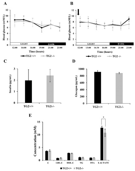 Blood glucose levels of TG2+/+ and mice TG2-/- were the same on the control day both in the light and the dark periods (Figure 3A), and phenylephrine injection did not lead to changes (Figure 3B). Both insulin and glucagon levels were found similar in the serum samples of the strains obtained at the same time point after the treatment (Figure 3C,D). Furthermore, serum concentrations of lipid fractions cholesterol (C), low-density lipoprotein cholesterol (LDL-C), high-density lipoprotein cholesterol (HDL-C), triglyceride (TG), and free fatty acid (FFA) did not differ after phenylephrine treatment either in TG2+/+ or TG2-/- mice (Figure 3E). Interestingly, however, lactate concentration was significantly higher in the serum of TG2+/+ mice compared to TG2-/- ones (12.7+/−0.64 mM vs. 10.74+/−1.4 mM, p < 0.05) 13 h after the phenylephrine treatment (Figure 3E).