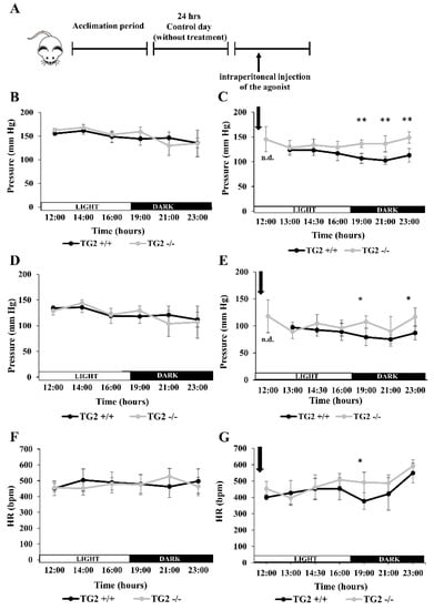 Comparing TG2+/+ and TG2-/- mice, we found that both their tail blood pressure (TBP) and heart rate (HR) values were very similar before the treatment (Figure 4B,D,F). Oddly, at the first measurement time point of the experiment, that was 30 min after the injection of phenylephrine, we could not record both systolic and diastolic pressure of all the investigated TG2+/+ mice in contrast to TG2-/- animals in which detection of TBP was successful. Besides, while TBP values of the strains were similar in the light period, systolic pressure values and two of the three detected diastolic pressure values were significantly lower in TG2+/+ animals compared to TG2-/- mice in the dark period (Figure 4C,E). As a result, TBP values of TG2-/- mice remained unchanged after the phenylephrine treatment, while those of TG2+/+ animals were lower in the dark period compared to the control day (Figure 4C vs. Figure 4B; Figure 4E vs. Figure 4D). Furthermore, we did not detect differences in HR values of the strains except the second measurement of the dark period after the treatment, when TG2+/+ showed lower levels (Figure 4F,G).