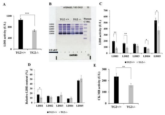 Serum samples of TG2+/+ mice isolated 13 h after the phenylephrine treatment contained a significantly higher level of LDH compared to TG2-/- animals’ (725+/−34 U/L vs. 1142+/−58 U/L, p < 0.001; Figure 5A). Electrophoretic separation and densitometry revealed that four out of the five isoenzymes were present in larger quantities in TG2+/+ samples than in TG2-/- ones, namely LDH1, LDH2, LDH4 and LDH5 (Figure 5B,C). The KO/wild type (WT) ratios of the isoenzymes LDH2, LDH4, and LDH5 were similar. However, the KO/WT ratio of LDH1, which may represent a cardiac-specific component, was lower (11%+/−2% vs. 17%+/−1%, p < 0.05; Figure 5D). Moreover, the level of CK-MB was also higher in the serum samples of TG2+/+ mice compared to TG2-/- animals’ (235+/−30 U/L vs. 158+/−16 U/L, p < 0.01; Figure 5E).