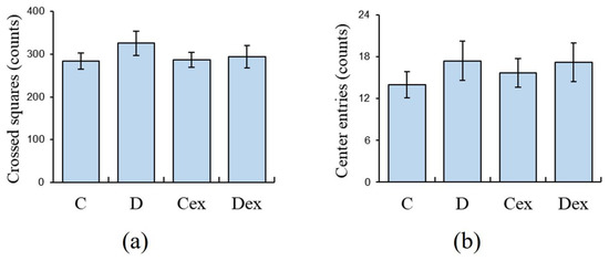 Spontaneous locomotor activities in the open field test. Animals were allowed to explore in an open field for 10 min. There were no significant differences among groups in (a) number of crossed squares or (b) center entries. C: control; D: DEHP exposure; Cex: exercised control; Dex: exercised DEHP exposure. Data are presented in mean ± SEM (n = 10 in each group).