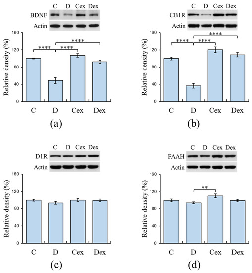 The tissue samples were homogenized in an ice-cold lysis buffer (20 mM Tris, pH 7.5, 150 mM NaCl, 1 mM EDTA, 1 mM EGTA, 1% Triton X-100, 1% deoxycholate, 1 mM sodium fluoride, and 2 mM sodium orthovanadate) and centrifuged at 13,000× g for 20 min at 4 °C. Protein in the supernatant was quantified using a BCA Protein Assay Kit (ThermoFisher, Waltham, MA, USA) according to the manufacturer’s instructions. Thirty micrograms of protein were mixed with NuPage LDS sample buffer (Invitrogen, Carlsbad, CA, USA) and separated by pre-cast 4–12% Bis-Tris gel (Invitrogen, Carlsbad, CA, USA) in MOPS running buffer (Invitrogen, Carlsbad, CA, USA) for 50 min under 120 mA and 200 V. Proteins were transferred to polyvinylidene difluoride (PVDF) membrane (Millipore, Burlington, MA, USA) in NuPage transfer buffer (Invitrogen, Carlsbad, CA, USA) for 60 min under 170 mA and 30 V condition. After blocking with 5% nonfat milk in TTBS buffer (10 mM Tris, pH 7.5, 150 mM NaCl, and 0.1% Tween 20), the membrane was incubated with primary antibodies specific for each protein for 24 h at 4 °C: rabbit anti-BDNF antibody (1:1000, ab108319, Abcam, Eugene, OR, USA), mouse anti-D1R antibody (1:200, sc-33660, Santa Cruz, Santa Cruz, CA, USA), rabbit anti-CB1R antibody (1:200, ab23703, Abcam, Eugene, OR, USA), mouse anti-FAAH antibody (1:200, sc-100739, Santa Cruz, Santa Cruz, CA, USA), mouse anti-PGC-1α antibody (1:200, ST1202, Merck, Kenilworth, NJ, USA), rabbit anti-GAPDH antibody (1:3000, ab9485, Abcam, Eugene, OR, USA), and mouse anti-actin antibody (1:5000, A2228, Sigma-Aldrich, St. Louis, MO, USA). After washing, the blot was incubated with horseradish peroxidase (HRP)-conjugated goat secondary antibodies (1:2000, ab97051 and ab97023, Abcam, Eugene, OR, USA) for 60 min at room temperature. The expression of the protein was detected by enhanced chemiluminescence (Invitrogen, Carlsbad, CA, USA) according to the recommended conditions. A Western blot analysis was performed in duplicate for each sample, and average protein levels were calculated for comparison. Digital images of the blots were created by scanning the blots, and the optical densities were determined with the Image-Pro Plus software (Media Cybernetics, Rockville, MD, USA). Each protein level was normalized to the control samples from the same membrane and presented as a percentage.
