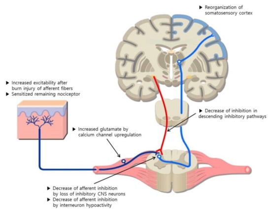 After the acute phase of healing, histamine is known to be less important to the mechanism of pruritus. In the chronic phase, it converts to the neuropathic type of pruritus characterized by antihistamine-resistant wounds with sensitized CNS. Increased neuropeptides, such as nerve growth factor, substance P, and the upregulation of calcium channel in the spinal cord, cause CNS sensitization in chronic burns. Thus, the CNS activates autonomously, which shifts maintenance into a chronic phase. Finally, a burn injury can induce synaptic reorganization. The post-burn state has been linked with alterations to the functional topography in the primary somatosensory cortex. This induces a reorganization of the somatosensory cortex that produces a distorted mapping of the skin [25].