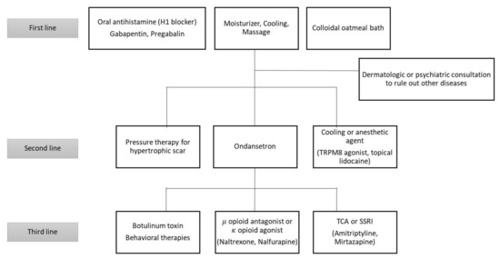 - Fowler, E.; Yosipovitch, G. Post-Burn Pruritus and Its Management—Current and New Avenues for Treatment. Curr. Trauma Rep. 2019, 5, 90–98. [Google Scholar] [CrossRef]