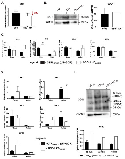 Change in expression of heparan sulfate proteoglycan (HSPG) core proteins following SDC-1 KD in hMSC undifferentiated and differentiated cultures. SDC-1 KD resulted in (A) a 20% reduction in SDC-1 gene expression in undifferentiated hMSCs when compared to control (CTRL; Untreated (UT) + Scrambled (SCR)) cultures; and (B) an 18% increase in protein expression identified by Western blot analysis of SDC-1 core protein expression via anti-syndecan-1 antibody (ab34164, Abcam). SDC-1 protein was assessed in UT, SCR and SDC-1 KD samples after 96 h of incubation of SDC-1 specific siRNA, with GAPDH as the loading control. Gene expression analysis by Q-PCR of (C) Syndecan-1-4 (SDC1-4) and (D) Glypican-1-4, and -6 (GPC-1-4, -6) core protein gene expression in differentiated hMSC CTRLAD/OS and SDC-1 KD AD/OS cultures. Error bars represent SEM. (E) Western blot analysis of HS 3G10 epitope (H1890-75, US Biological) in hMSC UTAD, SCRAD and SDC-1 KDAD samples. Optical density of protein bands quantitated using ImageJ (NIH) and target signals were normalised to the loading control GAPDH.