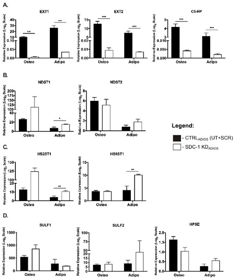 Gene expression level changes of heparan sulfate biosynthesis and modification enzymes in CTRLAD/OS and SDC-1 KDAD/OS hMSC differentiated cultures. Gene expression levels of (A) exostosins 1-2 (EXT1-2) and C-5 epimerase (C5-EP), (B) N-deacetylase/N-sulfotransferases 1-2 (NDST1-2), (C) heparan sulfate 2-O-sulfotransferase 1 (HS2ST1) and heparan sulfate 6-O-sulfotransferase 1 (HS6ST1), and (D) sulfatases 1-2 (SULF1-2) and heparanase (HPSE) in differentiated hMSC CTRLAD/OS and SDC-1 KDAD/OS cultures. Gene expression analysis was performed with terminally differentiated hMSC cultures, in which RNA was collected after 21 days (osteogenesis) and 22 days (adipogenesis) of differentiation. Significant difference in expression levels were analysed by Student’s T test, significance was set at * p < 0.05, ** p < 0.01 and *** p < 0.001. Error bars represent SEM.