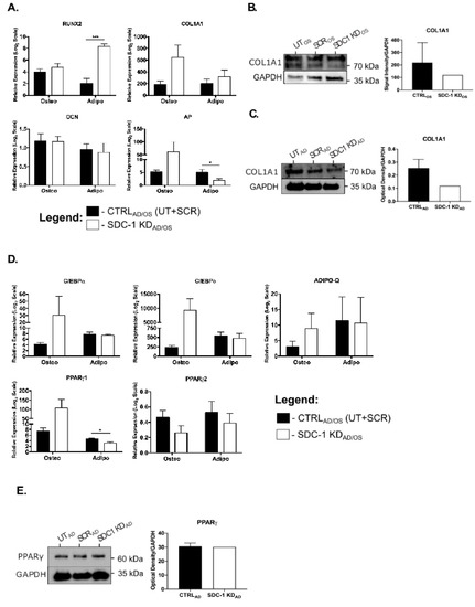 Osteogenic and adipogenic lineage marker expression changes in hMSC SDC-1 KDAD/OS lineage differentiation cultures. Analysis of lineage specific markers was performed with terminally differentiated hMSC cultures, in which RNA and protein was collected after 21 days (osteogenesis) and 22 days (adipogenesis) of differentiation. (A) Gene expression changes of osteogenic markers runt-related transcription factor 2 (RUNX2), collagen, type I, alpha 1 (COL1A1), osteocalcin (OCN) and alkaline phosphatase (AP) in hMSC CTRLAD/OS (UT+SCR) and SDC-1 KDAD/OS cultures. Western blot analysis and optical density quantitation of osteogenic marker COL1A1 in UTAD/OS, SCRAD/OS and SDC-1 KDAD/OS conditions in (B) hMSC osteogenic cultures and (C) hMSC adipogenic cultures. (D) Gene expression analysis of adipogenic markers CCAAT/enhancer binding protein alpha (C/EBPα), CCAAT/enhancer binding protein delta (C/EBPδ), peroxisome proliferator-activated receptor gamma 1 (PPARγ1) and 2 (PPARγ2), and adiponectin (ADIPO-Q) in hMSC CTRLAD/OS (UT+SCR) and SDC-1 KDAD/OS cultures. (E) Western blot analysis and optical density quantitation of adipogenic marker PPARγ in UTAD, SCRAD and SDC-1 KDAD conditions of hMSC adipogenic cultures. Significant differences in gene expression were determined by Student’s T test. Significance level was set at * p < 0.05 and *** p < 0.001. Error bars represent SEM. Quantitation of optical density of Western blots was performed using ImageJ (NIH), error bar represent SD.