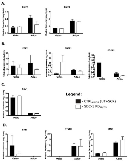 However, following hMSC lineage-specific differentiation in SDC-1 KDAD/OS conditions, no significant changes were observed in gene expression levels of these pathway components between CTRLAD/OS and SDC-1 KDAD/OS terminal cultures (Figure 5). In SDC-1 KDAD cultures, a non-significant decreased expression of BMP ligands, including BMP2 and BMP4 (Figure 5A), and FGF pathway components FGF2 and FGFR1 and FGFR2 (Figure 5B) was observed with FGFR3 and FGFR4 undetected in both SDC-1 KDAD/OD culture conditions (data not shown). In the SDC-1 KDOS cultures, FGFR2 expression was reduced, but this was not found to be significant (Figure 5B). No significant differences in Wnt (Figure 5C) and SHH (Figure 5D) signalling expression was observed between CTRLAD/OS and SDC-1 KDAD/OS conditions in the osteogenic and adipogenic cultures.