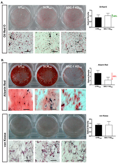 Oil Red O, Alizarin Red and von Kossa staining of hMSC SDC-1 KDAD/OS cultures following in vitro adipogenic (22 days) and osteogenic (21 days) differentiation. (A) hMSC SDC-1 KDAD cultures stained with Oil Red O. Plate image shows representative untreated (UTAD), scrambled (SCRAD) and SDC-1 knockdown (SDC-1 KDAD) conditions, with corresponding brightfield images (bottom panel). Quantitation of staining intensity of control (CTRLAD: UTAD and SCRAD combined) conditions and SDC-1 KDAD conditions showed a 20% increase in Oil Red O staining in SDC-1 KDAD cultures. (B) hMSC SDC-1 KDOS cultures: UTOS, SCROS and SDC-1 KDOS cultures with corresponding brightfield images stained with Alizarin Red and von Kossa staining. Alizarin Red staining of calcium deposits showed a 58% decrease in the SDC-1 KDOS cultures compared to CTRLOS cultures. The von Kossa stain targets anions of calcium salt, with equal staining observed between CTRLOS and SDC-1 KDOS cultures. Stained images were acquired using a flatbed scanner and signals quantitated using ImageJ (NIH). Microscopic brightfield images were taken using a Nikon Eclipse Ts2 microscope at 10× magnification, scale bar = 200 µm. Optical density of stain signals was normalised to cell number due to the significant differences observed between CTRLAD/OS and SDC-1 KDAD/OS cultures (as presented in Figure 1C,D).
