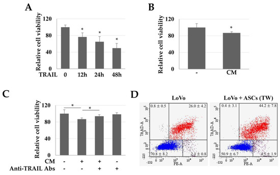To evaluate the TRAIL-dependent toxicity in colon cancer cells (LoVo), we used CM obtained from high-density cultures of ASCs. TRAIL (100 ng/mL) reduced the viability of LoVo cells in a time-dependent manner (Figure 2A). Similarly, CM increased the LoVo toxicity by about 13.17% (Figure 2B). Moreover, when the TRAIL in CM was neutralized with an anti-TRAIL antibody, the toxicity of CM in the LoVo cells was reduced (Figure 2C). These results suggest that the toxicity in LoVo cells by CM was TRAIL-dependent. In addition, in LoVo cells co-cultured indirectly with ASCs, the Annexin +/7-Aminodactinomycin (7-AAD) + population (apoptotic cells) was 44.2 ± 7.8%, indicating that apoptosis was increased by 1.7 times as compared to that in the control group (26.0 ± 4.2%) (Figure 2D).