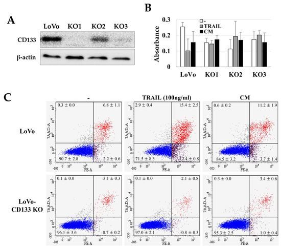 We investigated the TRAIL sensitivity of CD133+ CSCs by comparing the TRAIL effects on CD133knockout LoVo cells (LoVo-CD133 KO). We generated the LoVo-CD133 KO cells (Figure 3A) using the CRISPR-Cas9 gene-editing system, as in our previous report [33]. Interestingly, the TRAIL-induced apoptosis was dramatically increased in the CD133+ LoVo cells, while there was no significant difference in the apoptosis of LoVo-CD133 KO cells (Figure 3B,C). In addition, the CM obtained from ASCs cultured at high density increased the apoptosis of LoVo cells, while no apparent effect was detected for LoVo-CD133 KO cells (Figure 3C).