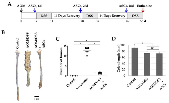 Suppression of colon cancer development by ASCs. (A) Schematic timeline for azoxymethane (AOM)/dextran sodium sulfate (DSS)-induced colon cancer and ASC transplantation. (B) Gross tumor burden by AOM/DSS and inhibition of tumor development by ASCs. (C) Reduced tumor numbers by ASC transplantation. The number of tumors in colons obtained from the control, AOM/DSS, and AOM/DSS + ASCs groups (n = 5) were counted. * p < 0.05. (D) Lengths of colons obtained from the control, AOM/DSS, and AOM/DSS + ASCs groups. * p < 0.05. ns: not statistically significant.