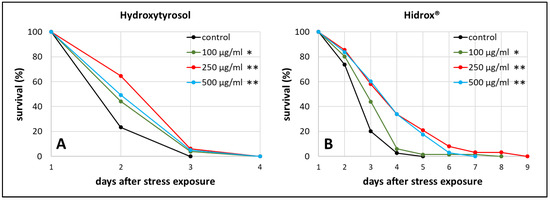 We observed the survival of worms starting from the 3rd day of adulthood, which was the day of heat stress exposure, until all worms died. The mean survival, which refers to the time between that stress exposure day until the end of the test, was increased by about 22% (from 2.23 days in the control group to 2.71 days in the treated group) during 250 µg/mL HT treatment (Figure 1A), whereas 250 µg/mL HD extended the survival by even 40% (from 2.96 in the control to 4.13 days) (Figure 1B). Moreover, the maximum survival, defined as the time point when 90% of the population was dead, increased by 63% during 250 µg/mL HD treatment (p ≤ 0.001 with Fisher’s Exact Test) and only by 14% during 250 µg/mL HT treatment (p ≤ 0.05 with Fisher’s Exact Test) compared to the respective control. 250 µg/mL was the most effective concentration for both treatments in terms of mean and maximum survival after stress exposure (Table S1), thus, this concentration was selected for the following experiments.