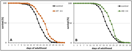 Finally, the influence of HT and HD on the mortality rate was measured in wild type nematodes under standard laboratory conditions. The treatment with 250 mg/mL HT and HD resulted in an increase of mean lifespan by 14% (Figure 3A) and 12% (Figure 3B), respectively. The maximum lifespan, however, was only slightly (without significance according to the Fisher’s Exact Test) increased by 7% after HD-treatment and the biggest increase was visible in the median lifespan (16%). A similar pattern was observed in the HT-treated group.