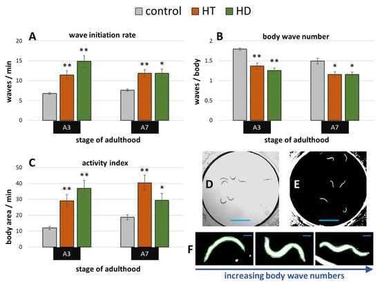 Effect of HD and HT on rotenone induced locomotion impairment. 10 µM rotenone administration with and without simultaneous HD or HT treatment started at the fourth larval stage. The wave initiation rate (A), the body wave number (B) and the activity index (C) are shown at the third (A3) and seventh (A7) day of adulthood. Data are pooled from two biological repeats with ≥44 worms per treatment and age. The bars represent the mean ± SEM and differences compared to control were considered significant at p < 0.05 (*) and p < 0.001 (**). The appearance of single frames in swim analysis are shown before (D) and after (E) image processing. In addition, single nematodes recognized by CeleST (as indicated by the green outline) are shown with increasing number of body waves (F). The blue scale bars represent 2.5 mm (D,E) and 200 µm (F), respectively.