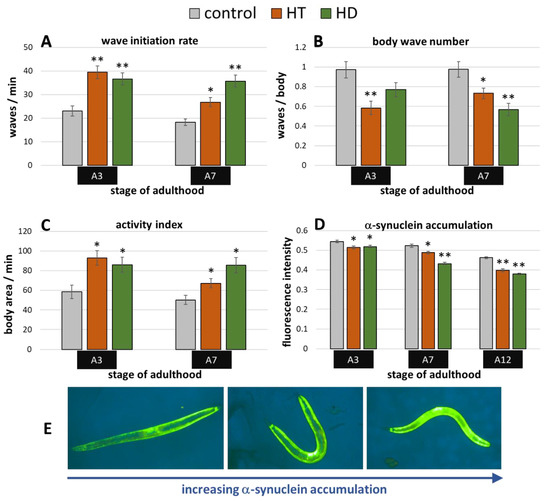 Furthermore, the Parkinson’s model ‘UA44′ was used to investigate the anti-Parkinsonian capacities of the polyphenol treatments. This strain is characterized by the expression of α-synuclein in dopaminergic neurons, which does not lead to distinct movement deficits [53] but to accelerated neurodegeneration [54]. Interestingly, only the wave initiation rate could profit from HT and HD treatment in this model (Figure 6A): HT increased the rate by 11% (A3) and 26% (A7) and HD by 45% (A3) and 28% (A7). No enhancement could be observed in the body wave number (Figure 6B) or the activity index (Figure 6C) by either polyphenol treatment.
