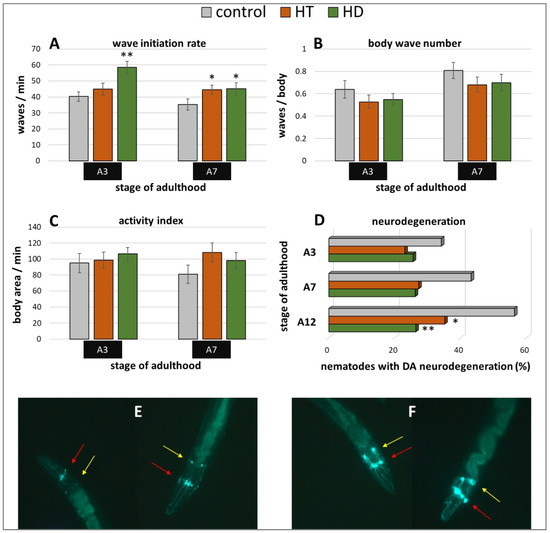 In the UA44 strain, the green fluorescent protein (GFP) is linked to the dopamine transporter in dopaminergic neurons, thus, the vitality of the six anterior and two posterior dopaminergic (DA) neurons can be observed with a fluorescent microscope. The α-synuclein-induced damage of the nerve cells manifests as lowered or missing fluorescence in single neurons, whereas the classification of intact and degenerated anterior DA neurons were performed as described in Harrington et al. [55] and as illustrated in Figure 6E,F. The increase of degenerated neurons with age could be completely blocked by 250 µg/mL HD (Figure 6D). In all age classes, the quantity of degenerated anterior DA neurons constantly amounts to about 26% in the HD-treated group, whereas the quantity of degenerated neurons in the control group increased by 22% from 34% (A3) to 56% (A12). HT-treated nematodes also featured a neuroprotective effect, however, an increase of neurodegeneration with age is still visible.