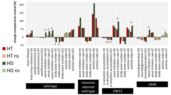 To compare the efficiencies of the action of HT and HD in all bioassays, the percentage changes relative to the respective control without polyphenol treatment were calculated and illustrated (Figure 7), whereas saturated and light-coloured bars represent significant and non-significant changes to the control, respectively. Furthermore, the measurements in the HT- and HD-treated groups were statistically compared with each other and labelled with * (p < 0.05) or ** (p < 0.001). Both polyphenol treatments are very efficient in enhancing all swim parameters in the rotenone PD-model and no significant differences could be detected between the HT- and HD-treated groups. However, in the wild type, the advantage of HD compared to HT is visible in two of the three locomotion characteristics. Since the measurements of lifespan and heat stress resistance were performed separately and with different control-groups, no direct comparison was possible in these cases. The effect of HD and HT was quite similar in the UA44 transgenic strain; only the wave initiation rate of young UA44-nematodes differed in HT- and HD-treated nematodes with a significant advantage in the HD-treated group. Moreover, the advantage of HD compared to HT is clearly visible in older OW13 nematodes, where α-synuclein accumulation, wave initiation rate and activity index featured a more pronounced benefit from the HD-treatment. None of the measurements in any strain exhibited an advantage of HT compared to HD.