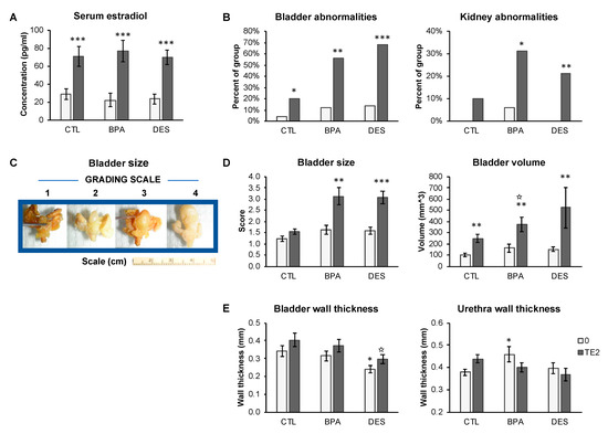 Figure 1. Serum estradiol concentrations and bladder, kidney, and urethra metrics in control (CTL-), BPA-, or DES-treated mice, without (0, light bars) and with (TE2, dark bars) adult treatment. (A) Serum estradiol concentrations and (B) incidence of bladder and kidney abnormalities observed at the time of necropsy. (C) Examples of bladder size using the observational grading scale. (D) Bladder size based on observational grading (left) or on volume calculated from external dimensions (right) in fixed tissues. (E) CT measurements of bladder wall thickness and post-prostatic urethra wall thickness in fixed tissues. Values are mean ± SEM. * P < 0.05, ** P < 0.01, *** P < 0.001 vs. CTL-0; ✫ P < 0.05 vs. CTL-TE2.