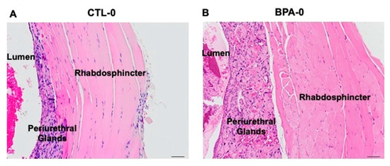 Figure 2. Post-prostatic urethra between the prostatic and penile urethra. Hematoxylin and eosin stained sections of the urethra wall from adult male mice. (A) CTL-0 male, showing normal lumen and urethra wall: periurethral mucus glands, rhabdosphincter muscle. (B) BPA-0 male showing thickened urethra wall due to glandular hyperplasia and an increase in thickness of the rhabdosphincter (20× magnification).