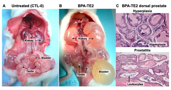Figure 3. (A) Normal urogenital system in a perinatal control male mouse treated in adulthood with an empty capsule (CTL-0). (B) Bladder obstruction and hydronephrosis in an animal exposed perinatally to bisphenol A (BPA) and given testosterone and estradiol (T+E2) treatment in adulthood, and (C) dorsal prostate (with hematoxylin and eosin staining) showing epithelial hyperplasia and leukocyte infiltration of prostatic ducts (indicative of prostatitis) in the same BPA-TE2 animal shown in B (40× magnification).