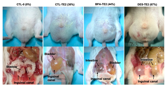 Figure 4. Examples of the effect of T+E2 treatment on inguinal hernias observed in this study, also showing the percent of males within each T+E2 group with inguinal hernias (only T+E2-treated males showed inguinal hernias). CTL-0 is an untreated normal male, and the lower panel shows the absence of an inguinal hernia. CTL-TE2 is a perinatal untreated male exposed to T and E2 in adulthood. The top panel shows the wetness of fur around the penis indicative of droplet voiding, and the bottom panel shows an enlarged bladder in the right inguinal canal. BPA-TE2 is a male treated perinatally with BPA and then T and E2 in adulthood. The top panel shows the wetness of fur around penis, and the bottom panel shows an enlarged bladder herniated on the left side and the cecum herniated on the right side. DES-TE2 is a male treated perinatally with diethylstilbestrol (DES) and then T and E2 in adulthood. The top panel shows bulging in the scrotal region, and the bottom panel an intestinal herniation in the right and left inguinal canals. The incidence of hernias was significantly increased by T+E2 treatment for all perinatal treatment groups (P < 0.01).