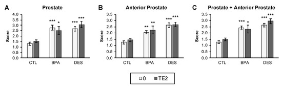 Figure 5. Assessment of prostate size (conducted blind) by observational grading. (A) Prostate size (dorsal, lateral, and ventral lobes), (B) anterior prostate size, and (C) size of the combined prostate and anterior prostate. Values are mean ± SEM of scores using a 4-point scale similar to that used for the bladder (see Figure 1 and Methods). * P < 0.05, ** P < 0.01, *** P < 0.001 vs. control males (CTL-0).
