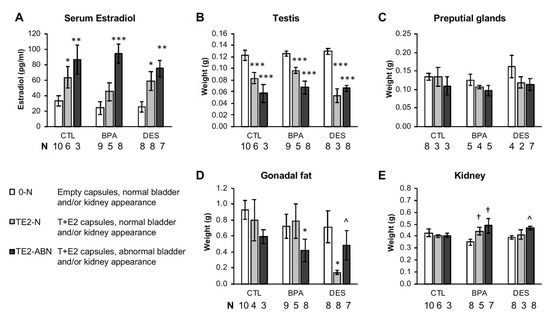 Figure 6. Serum estradiol and organ/tissue weights at necropsy in males without or with obstructed bladders and/or kidney abnormalities based on observational criteria (conducted blind to treatment group). (A) Serum estradiol concentrations in CTL, BPA, and DES animals with normal (N) or abnormal (ABN) bladder and/or kidneys. (B–E) Organ weights in the same animals (right testis, combined preputial glands, combined gonadal fat pads and right kidney). Values are mean ± SEM. ^ P = 0.07, * P < 0.05, ** P < 0.01, *** P < 0.001 vs. CTL-0-N; † P < 0.05 vs. the same perinatal treatment without T+E2 in adulthood.