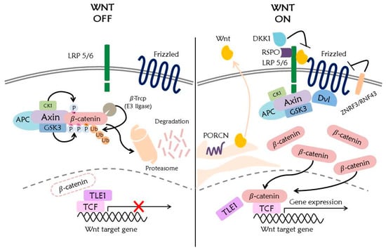 The secreted Wnt proteins interact with other Wnt receptors and co-receptors, including LRP5/6, receptor tyrosine kinase-like orphan receptor (ROR), protein tyrosine kinase 7 (PTK7), receptor tyrosine kinase (RYK), muscle skeletal receptor tyrosine kinase (MUSK), and a proteoglycan family [26]. The expression of Fz and LRP5/6 receptors on the cell surface is regulated by ubiquitination. Fz and LRP5/6 receptors are ubiquitinated by RNF43 and ZNRF3, which are RING domain-containing E3 ligases expressed by Wnt target genes. Also RFN43 inhibits the transcriptional activity of TCF4 by anchoring TCF to the nuclear membrane [33]. Thus, RNF43 and ZNRF3 function as negative regulators of the Wnt signaling pathway [34]. In addition to ubiquitination, other PTMs affecting Wnt receptor regulation are phosphorylation, glycosylation, and palmitoylation [21].