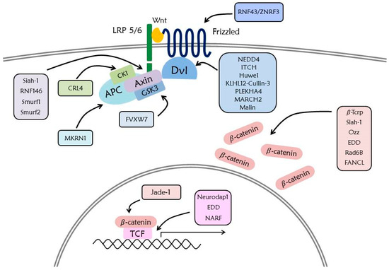 In the intranuclear process directly associated with the expression of Wnt target genes, the TCF family competitively binds with β-catenin and transducin-like enhancer (TLE) family [166]. In the absence of Wnt protein, TCF functions as a negative regulator to bind with the TLE family due to the ubiquitination-mediated degradation of cytoplasmic β-catenin [2]. However, in the presence of Wnt protein, the accumulated β-catenin is translocated into the nucleus, and binding between TCF and β-catenin promotes the transcription of Wnt target genes. The TCF/LEF1 are targeted by a RING-type E3 ligase, Neurodap1 (Pja2), which triggers ubiquitination and downregulates the protein levels of TCF/LEF1 LEF1 [167,168]. This process is associated with self-renewal and differentiation of embryonic stem cells [167]. EDD, also known as E3 ligase of β-catenin, promotes ubiquitin-mediated degradation of the TCF/LEF family [21]. Nemo-like kinase-associated ring finger protein (NARF) attaches the ubiquitin to TCF/LEF with the E2 ubiquitin ligase E2-25K, and represses formation of axis in Xenopus embryo [169].