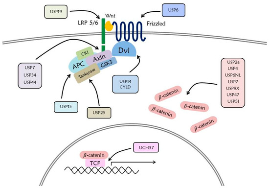 It was found that the PTM by ubiquitination regulates the stability of the primary Wnt signaling pathway components described above. Diverse E3 ligases participate in the regulation of the Wnt signaling pathway [151] (Figure 4). It has also been suggested that diverse DUBs that detach ubiquitin by E3 ligase are associated with Wnt signaling factors.